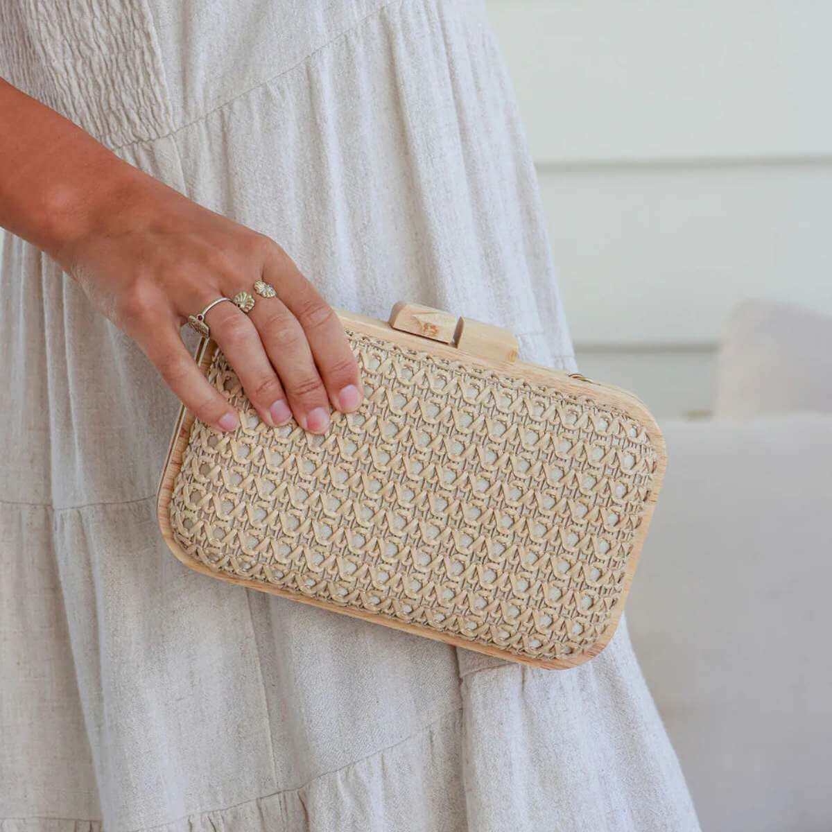 Crafted with a beautifully woven exterior in soft, earthy tones, this clutch brings effortless elegance to any warm-weather look. The statement resin chain strap adds a contemporary touch and can be detached for seamless styling, whether worn on the shoulder or carried in-hand. Accented with refined wooden edging and a smooth wooden clasp with magnetic closure, it’s lightweight yet structured — designed to hold your essentials while elevating every outfit.