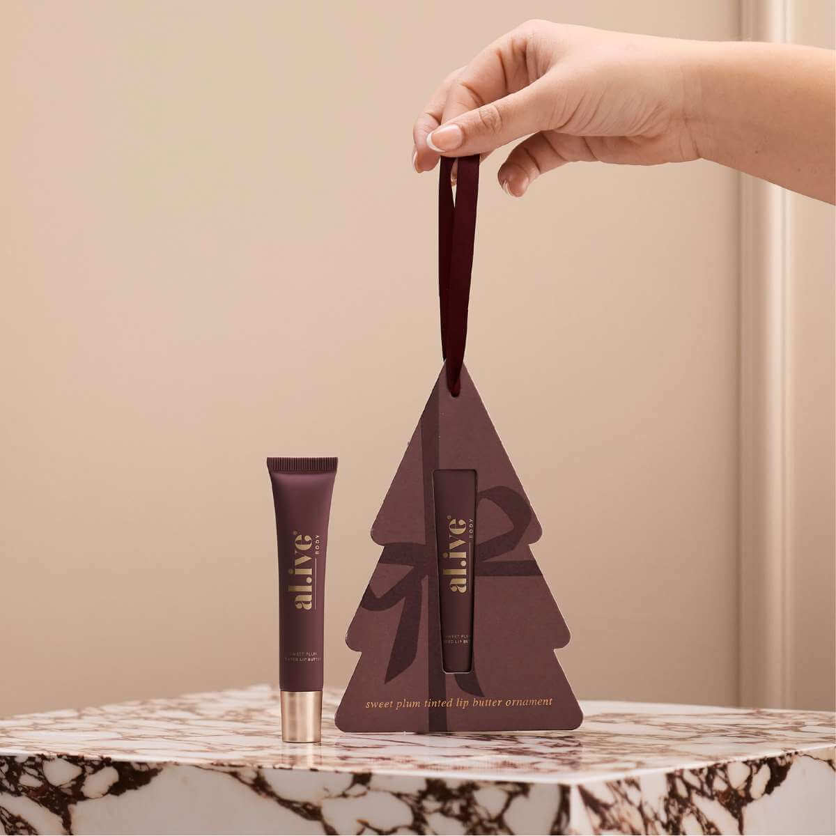 Bring a festive touch to your holiday gifting with the al.ive body Tinted Lip Butter Ornament in the limited-edition Sweet Plum shade.