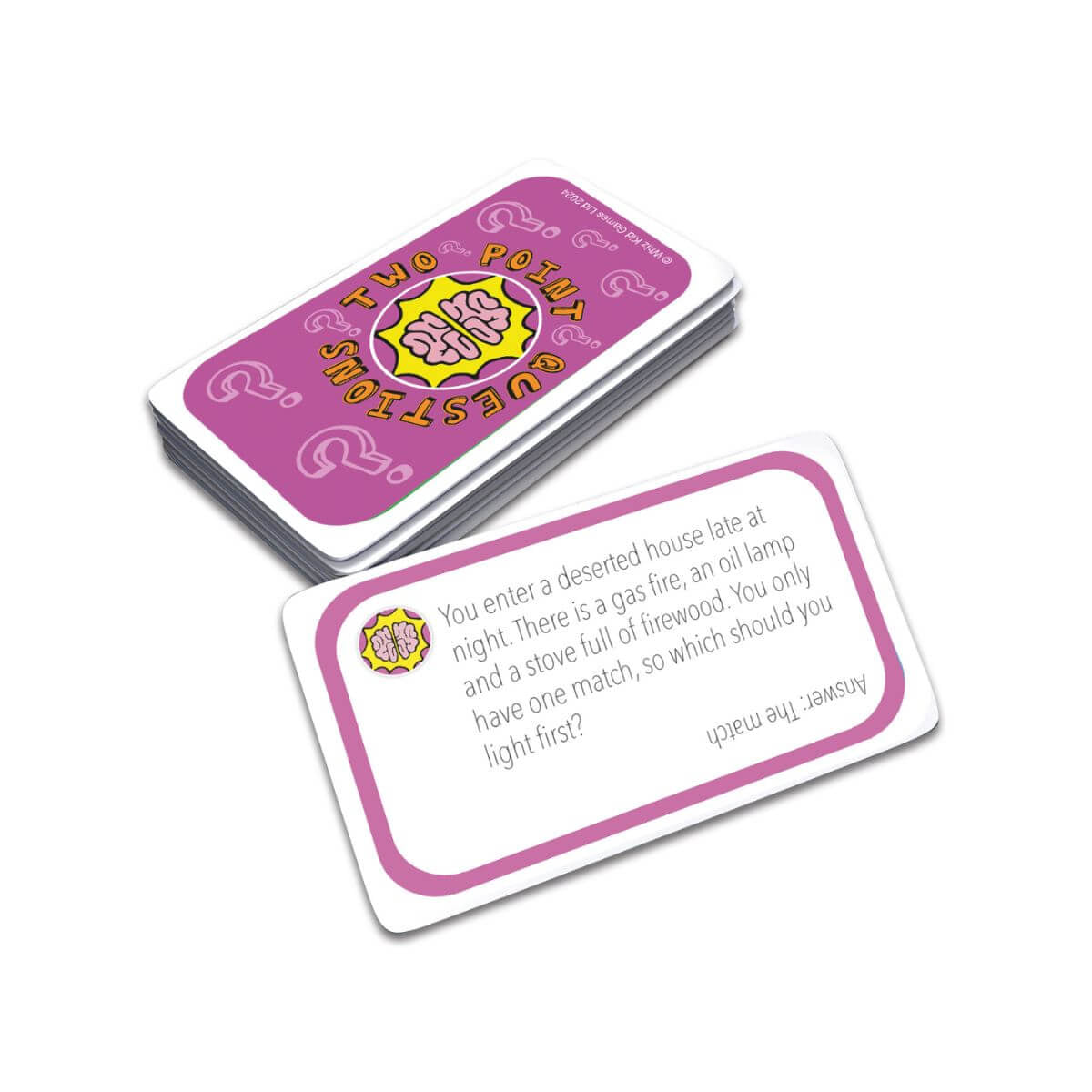The aim of the game is to get as many points as possible. Players travel round the board answering riddles that require players to throw logic to the wind and think laterally. They need to try and avoid the spaces that tell them to miss a go, move backwards or do a forfeit!